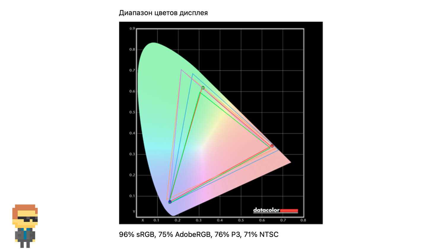 Покрывает гамму sRGB на 96%, AdobeRGB на 75%, P3 на 76% и NTSC на 71%.