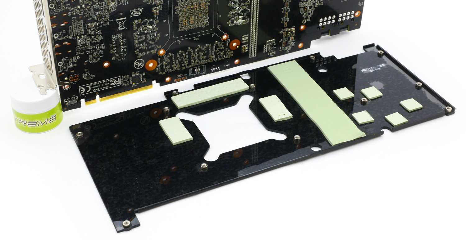 Удивляет применение пластикового бекплейта. В охлаждении тыльной стороны печатной платы он, естественно, не участвует, если не считать того, что для придания жёсткости пришлось использовать пластиковое ребро по периметру пластины — это серьёзно усложняет отвод тёплого воздуха и может привести к ухудшению температурного режима.
