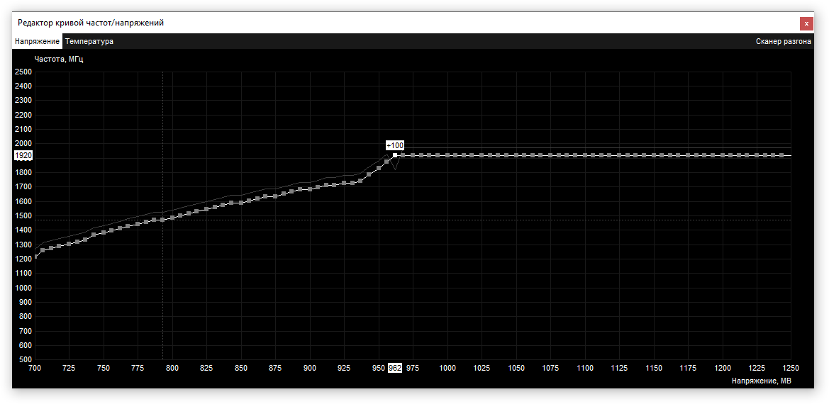 Если же подойти к тюнингу RTX 2080 Super GamingPro OC со стороны снижения энергопотребления, то отталкиваться будем от желаемой частоты, например 1920 МГц, с которой стартует карта по умолчанию в играх до снижения по температурным показателям. 962 мВ — минимальное напряжение, при котором карта сохраняет стабильность.