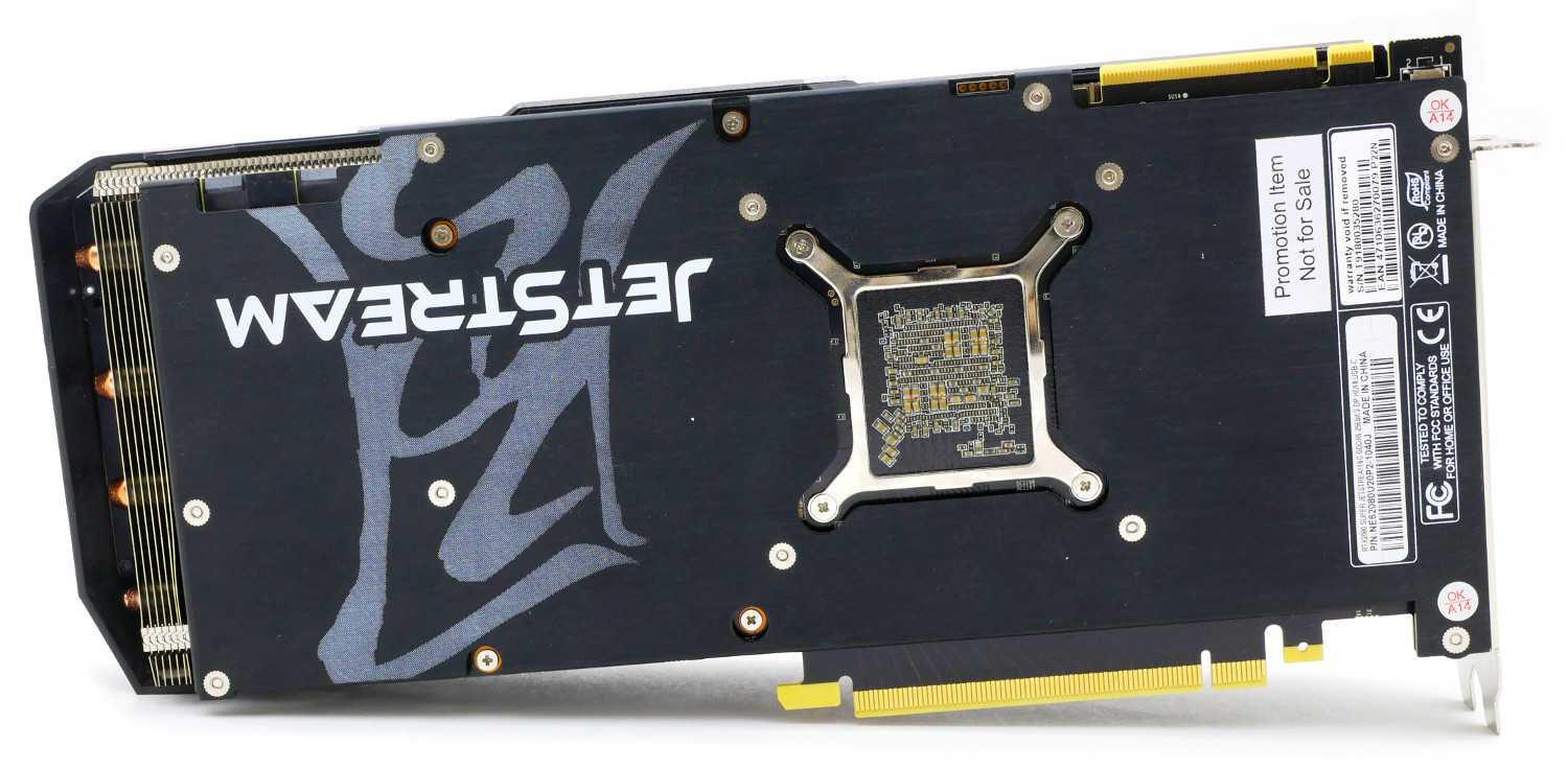 Оборотная сторона металлическая с рисунком. Бекплейт получил отверстия в конце, по примеру референсных моделей GeForce, но вентилятора вытягивающего через них воздух нет. Он с другой стороны.