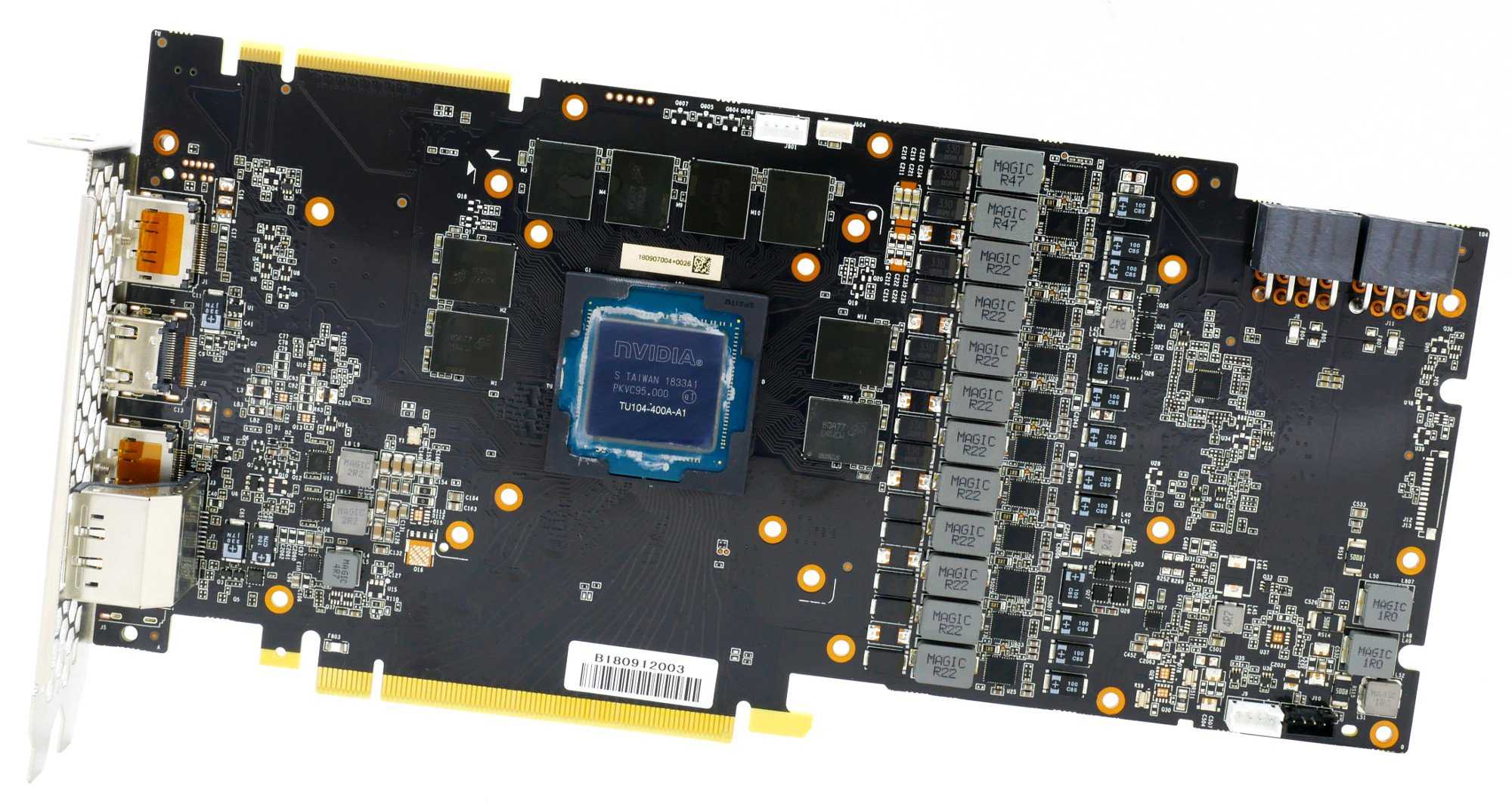 Сердцем героя обзора стал графический процессор TU104-400А-A1 с литерой «А» в наименовании, сигнализирующей о более высоких тактовых частотах и разгонном потенциале. Он произведен по 12-нм техпроцессу на 33-й неделе 2018 года,включает 2944 шейдера, 64 блока растеризации и 144 текстурных блока.