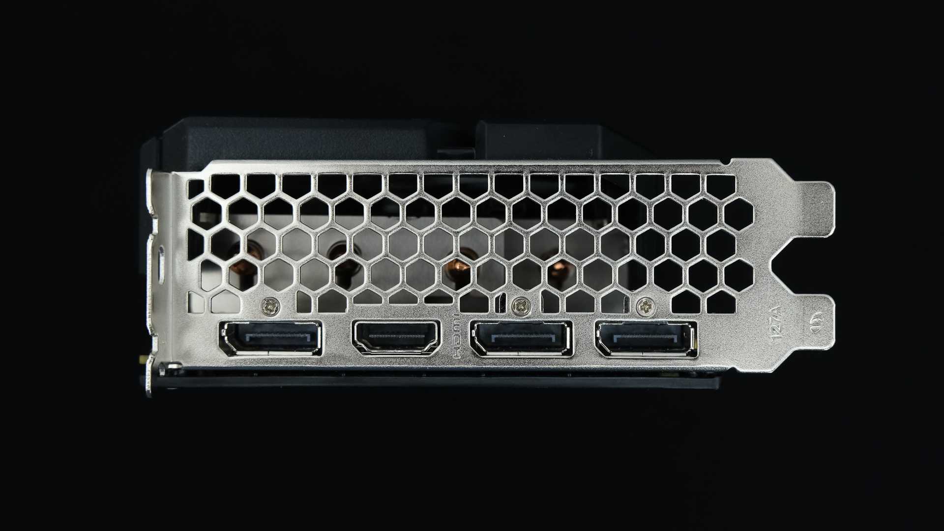 Задняя планка получила рисунок фирменных сот, набор интерфейсов классический: три порта DisplayPort 1.4, по одному HDMI 2.0b и USB Type-C.