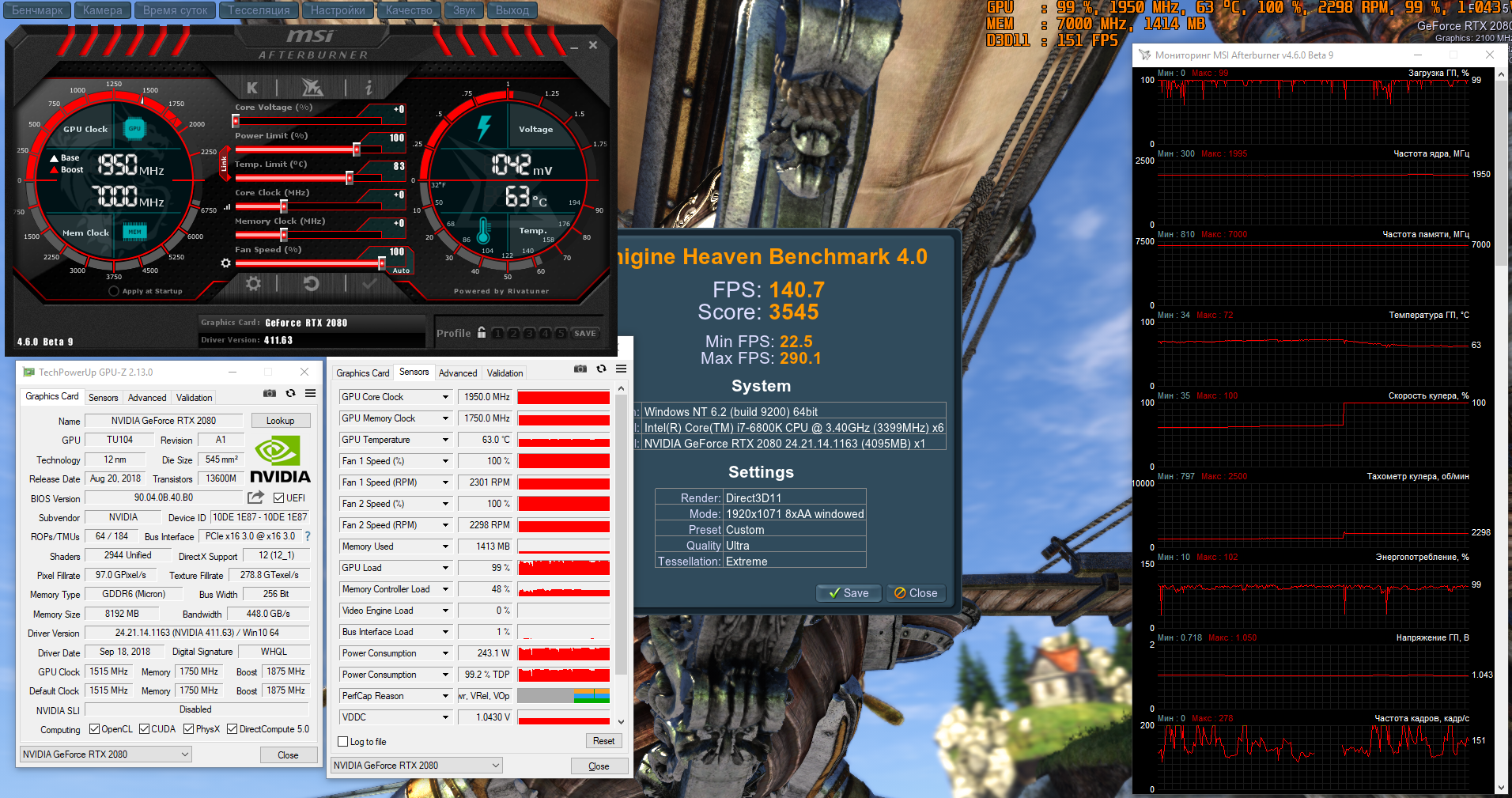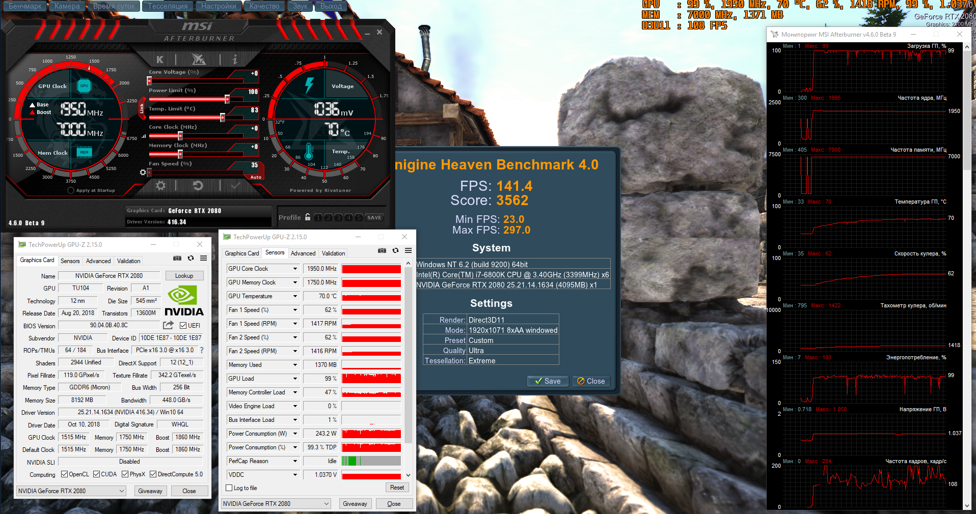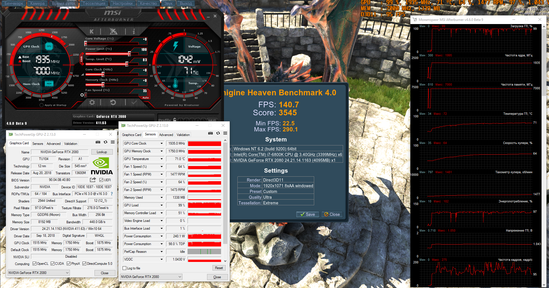 В играх видеокарта Palit GeForce RTX 2080GameRock Premium бустит до 1995 МГц, среднее значение по прошествии определенного времени и нагрева составляет 1935 МГц. Система охлаждения проявляется себя в полной мере и делает это достаточно при низком уровне шума, а вентиляторы едва раскручиваются до 1450 об/мин. В таком режиме новинка прогревается до 72*С по графическому чипу и до 79*С — по силовой части VRM.