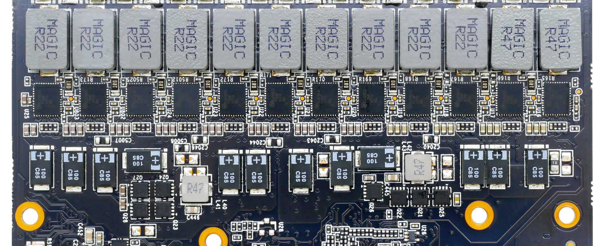 Вторая секция радиатора охлаждает силовую часть. Помимо мосфетов внимания удосужились и дроссели VRM.