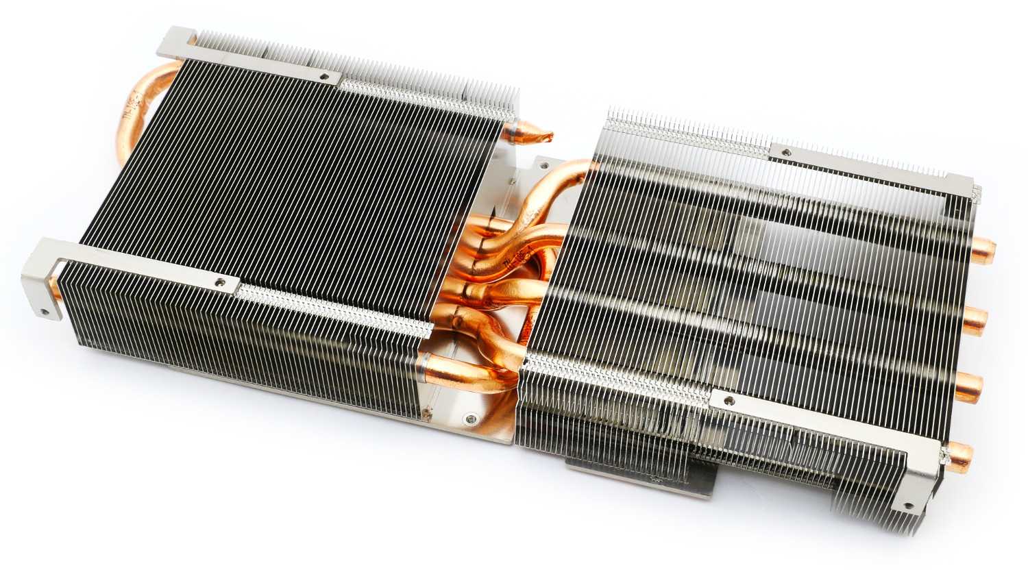 Трёхсекционный радиатор объединён шестью теплотрубками в одну систему. Для силовых элементов VRM предусмотрена контактные пластины. Микросхемы памяти также охлаждаются через алюминиевую пластину, соединённую с основным радиатором.