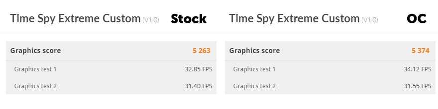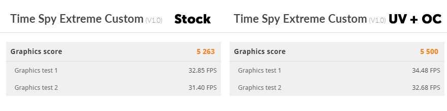 Изменение производительности зафиксируем в тесте 3DMark. Рост баллов всего на 2%: в особо ответственные моменты видеокарта упирается в предел мощности и вынуждена снижать частоты, более тонкая настройка кривой частот наверняка позволит добиться лучшего результата.