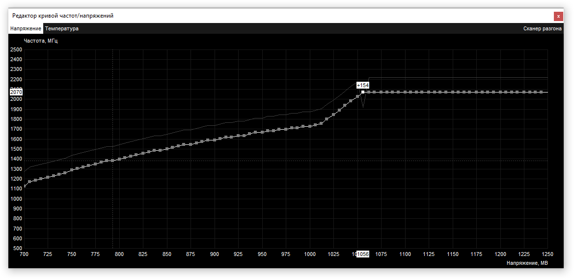 Выберем напряжение, которое считаем допустимым, например 1,056 В, и подберём для этого значения стабильную частоту буста. 2070 МГц показали себя стабильно в стресс-тестах.