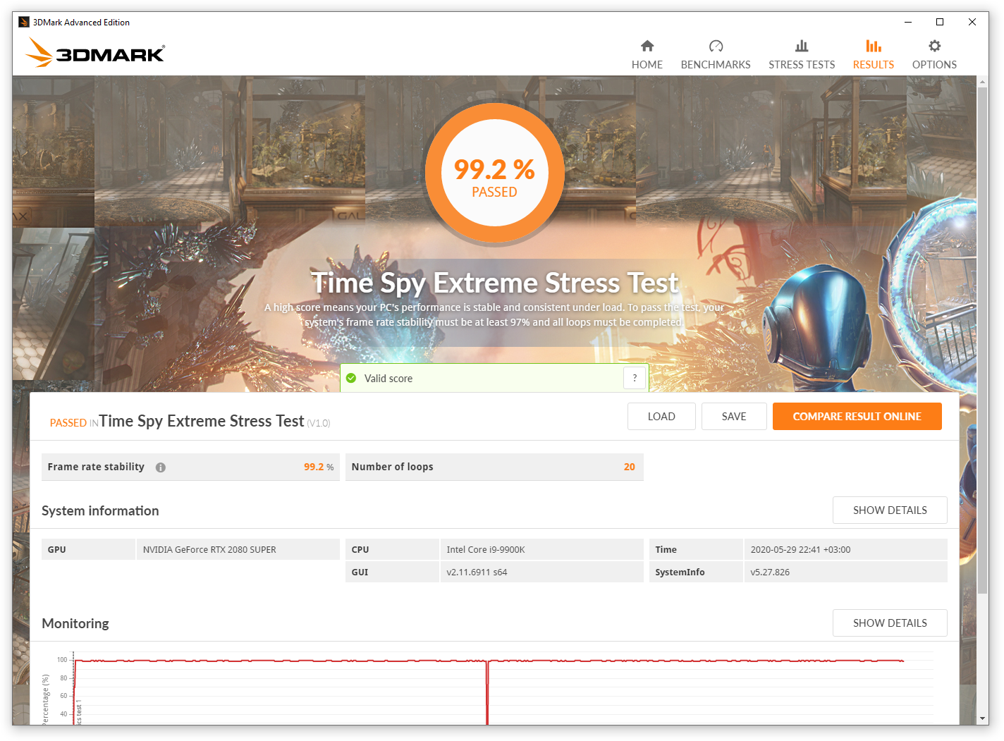 Тем же 3DMark Time Spy Extreme Stress Test создадим нагрузку для снятия показателей датчиков. Со стабильностью частоты кадров полный порядок — 99,2%.