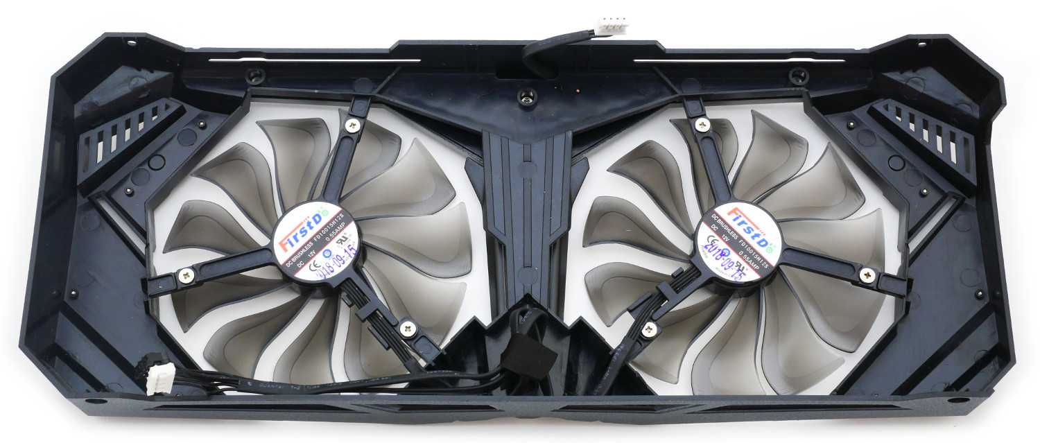 Активная система охлаждения и элементы RGB-подсветки крепятся на декоративном кожухе. Сразу отмечаем раздельное подключение двух вентиляторов, то есть каждый карлсон регулируется индивидуально силами видеокарты.