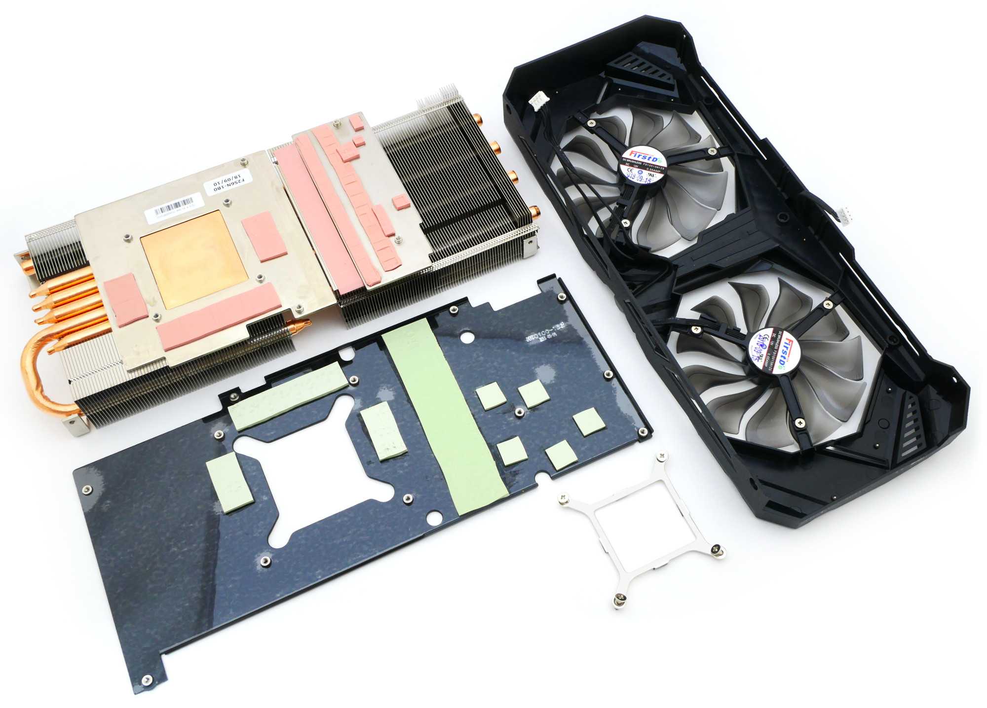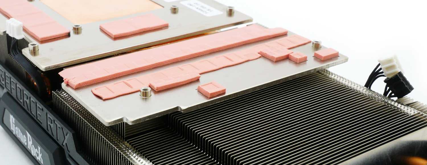 Кулер новинки накрывает основные элементы видеокарты и контактирует с чипами через розовые термопрокладки, а благодаря широкому основанию, микросхемы памяти также оказались «под колпаком».