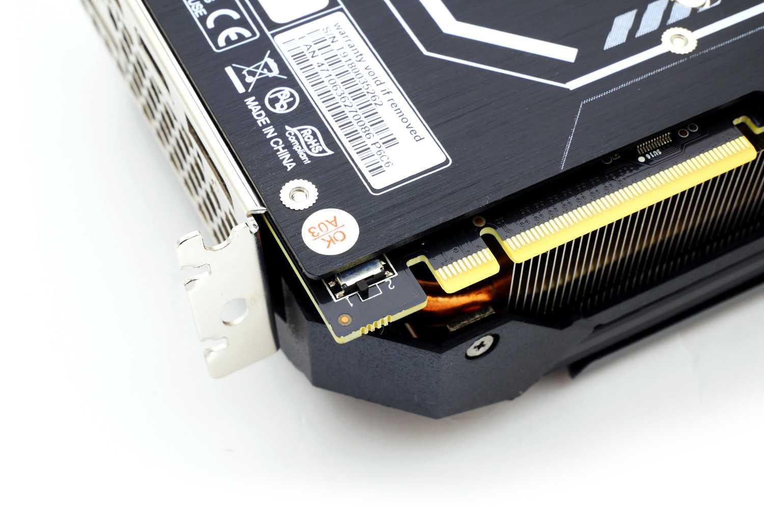 Неотъемлемой частью графических ускорителей Palit и фирменной технологией является Dual BIOS — переключатель, который теперь перекочевал к рамке крепления. На борту каждой из микросхем различные зашитые тактовые частоты и алгоритмы вентиляторов, также NVIDIA разрешила прошивку своих видеокарт, что позволяет лишний раз поэкспериментировать и добиться от своей «малышки» еще большей производительности.