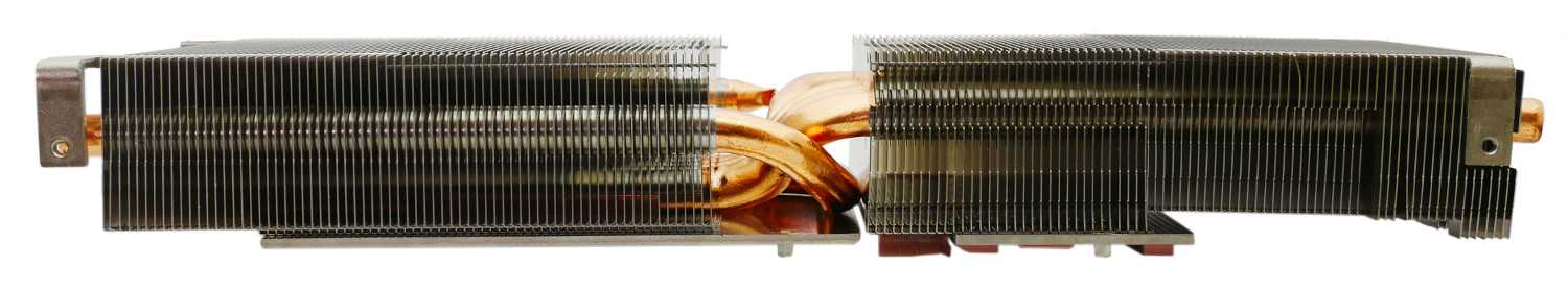 Если попытаться заглянуть под кожух видеокарты сверху, то видно, что там 2 радиатора, а не один длинный.