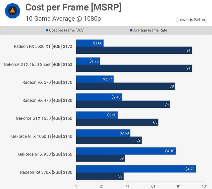 У Radeon 5500 XT кадр стоит на 23% дешевле, чем у RX 470, и только на 14% дешевле, чем у RX 570 (напоминаем, что мы говорим здесь про MSRP, а не про текущую рыночную цену RX 570). Ключевым моментом здесь является то, что спустя три года после выхода RX 470 кадр подешевел всего на 23% – у 5500 XT, от которой недалеко ушла и GTX 1650 Super.