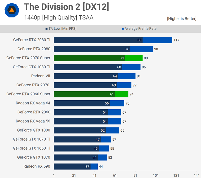 В Division 2 результаты похожи на те, которые мы получили в нескольких предыдущих играх: 2060 Super – на 10% быстрее стандартной версии 2060, а 2070 Super – на 14% быстрее стандартной 2070. При этом 2060 Super была быстрее Vega 64, а 2070 Super – быстрее Radeon VII.