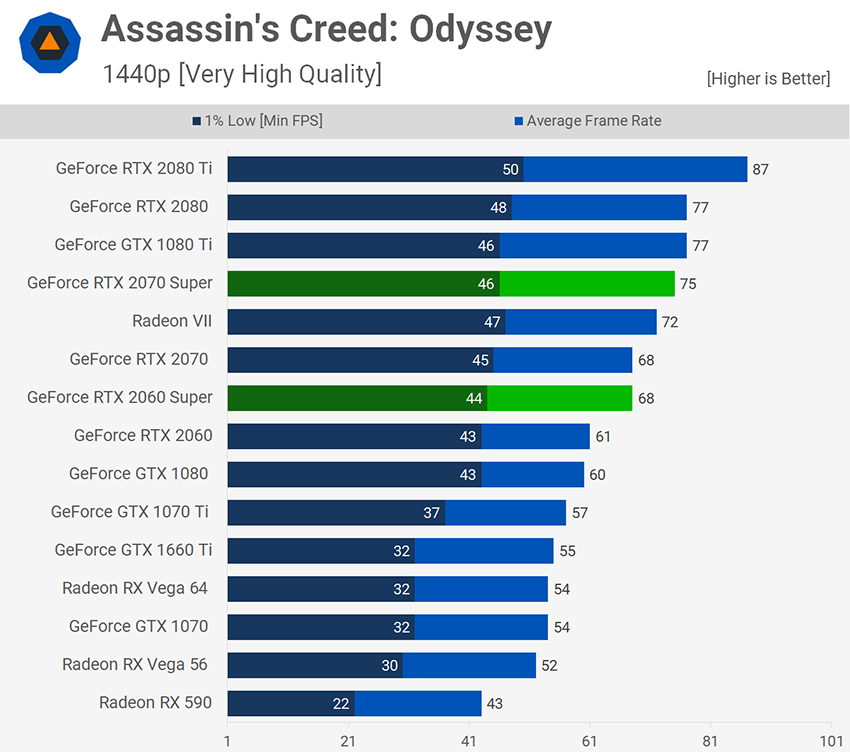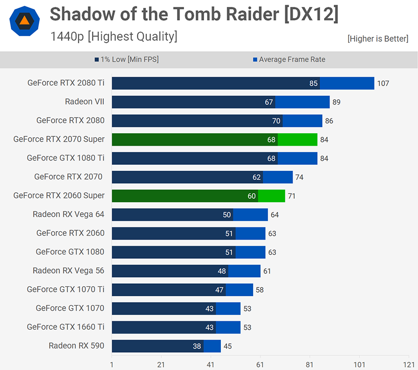Более впечатляющий результат карта 2060 Super показала в Shadow of the Tomb Raider, опередив RTX 2060, а заодно и Vega 64, уже на 13%. И здесь же 2070 Super показала одинаковую скорость с GTX 1080 Ti, уступив RTX 2080 всего пару кадров в секунду. Очень достойный результат.