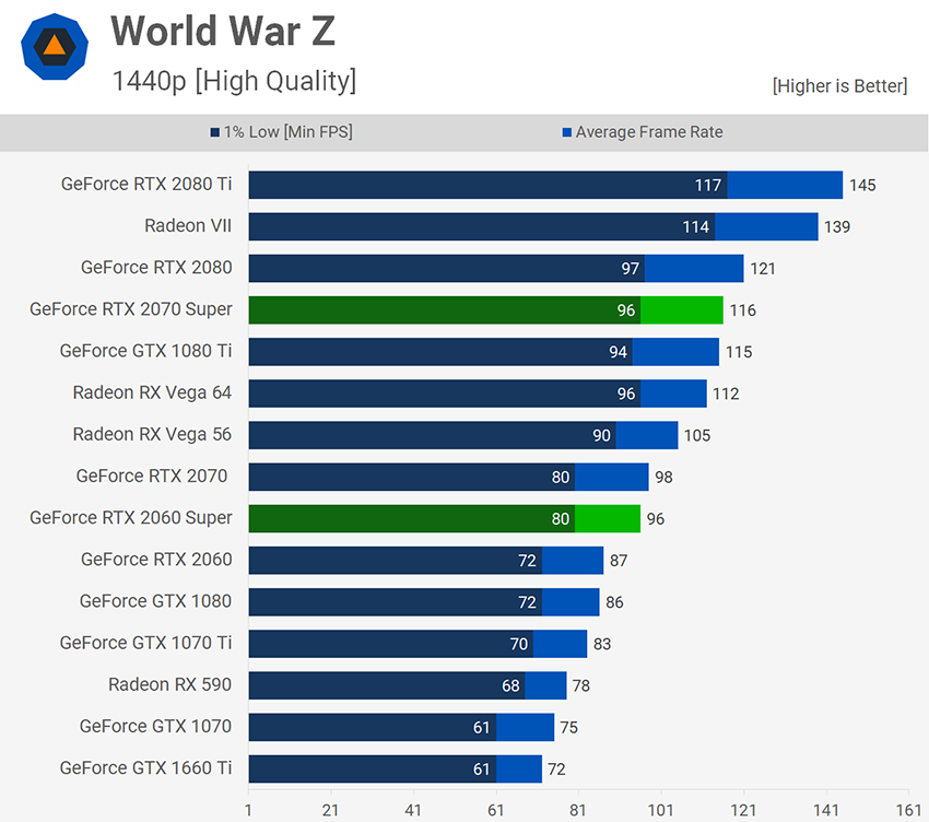 В World War Z карта RTX 2060 Super не смогла поддержать темп Vega 56, а Radeon VII была значительно быстрее 2070 Super. Однако, в играх с поддержкой Nvidia новые Super-карты смотрелись заметно лучше.