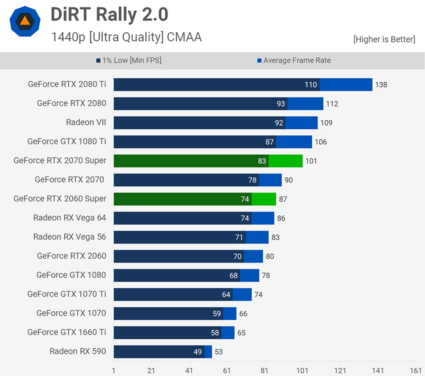 Гораздо лучше видеокарты Radeon выглядели в DiRT Rally 2, где 2060 Super смогла только показать одинаковую скорость с Vega 64 и была всего на 5% быстрее Vega 56, которая в настоящее время продается менее чем за $300. Карта 2070 Super в своем классе была всего на 7% медленнее Radeon VII, и этот относительный результат лучше, чем у Super-версии RTX 2060.