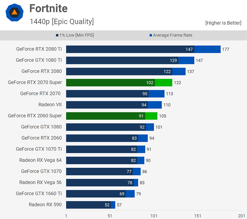 Fortnite – далеко не самая удобная игра для видеокарт AMD. Здесь RTX 2060 Super уступила гораздо более дорогой карте Radeon VII всего 5 fps. 2070 Super в этой игре была намного медленнее RTX 2080, но без проблем вынесла Radeon VII, опередив ее на 11%.