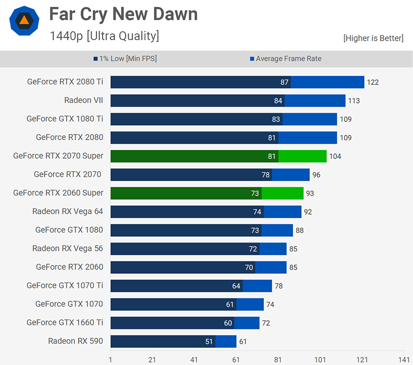 В Far Cry New Dawn мы видим 2060 Super сразу за 2070, а 2070 Super – сразу за 2080. При этом 2060 Super показывает практически одинаковый результат с Vega 64, а вот 2070 Super все-таки оказывается на 8% медленнее Radeon VII.