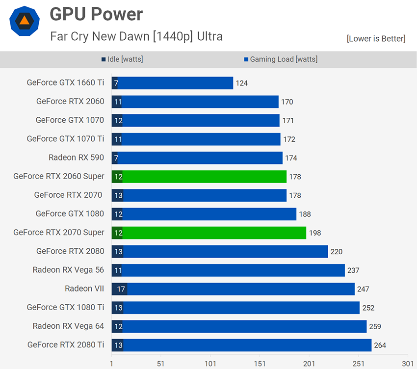 С первого же взгляда на таблицу энергопотребления видеокарт видно, что RTX 2060 Super – очень эффективное решение: она потребляет всего на 5% больше по сравнению со стандартной версией 2060 и всего на 2% (т.е. на 4 Вт) больше, чем Radeon RX 590.
