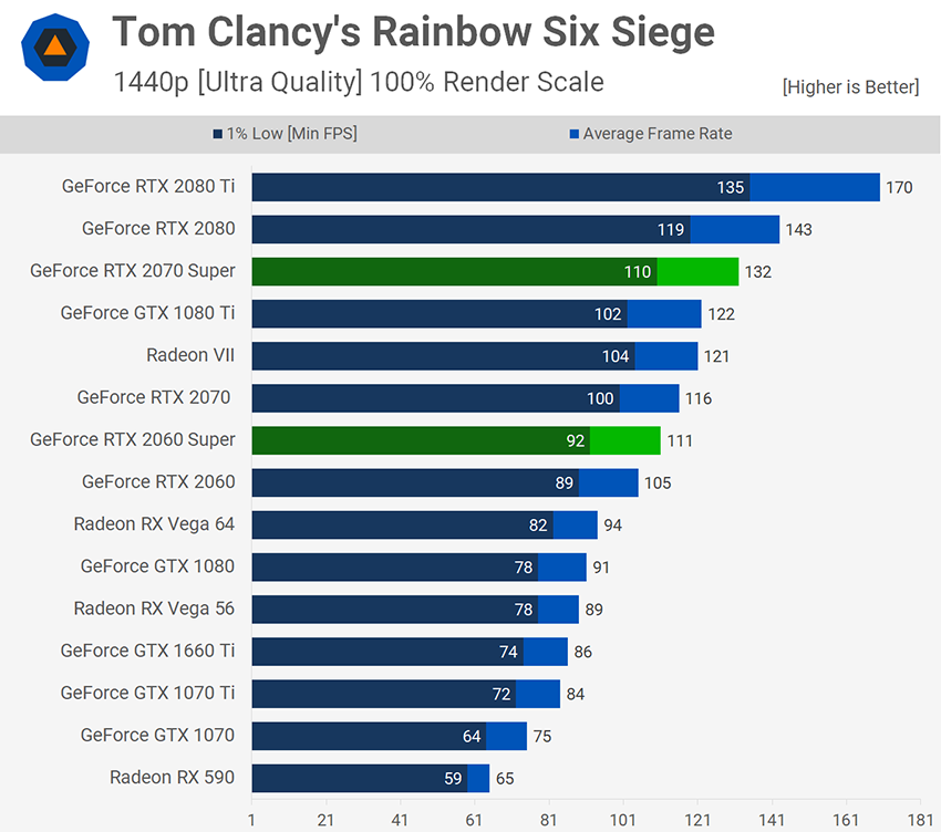 В Tom Clancy’s Rainbow Six Siege карта RTX 2070 Super оказалась ближе к 2080, чем к 2070, а также с комфортным преимуществом опередила относительно старую GTX 1080 Ti, а заодно и AMD Radeon VII. Это очень солидный результат.