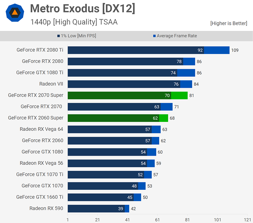 Переходим к Metro Exodus. Здесь карта 2070 Super наступает на пятки Radeon VII, уступая ей всего несколько кадров в секунду. И это тоже говорит о том, что по уровню она ближе к RTX 2080, чем к 2070. И здесь же мы видим, что 2060 Super превосходит стандартную версию 2060 на 10%, демонстрируя производительность уровня 2070.