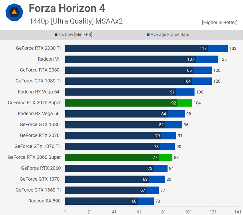 Forza Horizon 4 – еще один симулятор автогонок и, как ни странно, еще одна подходящая игра для карт AMD. Здесь Radeon VII обгоняет 2070 Super – так, что новая 500-долларовая карта Nvidia оказывается на 17% медленнее. Карта 2060 Super проигрывает Vega 56, причем целых 10%.