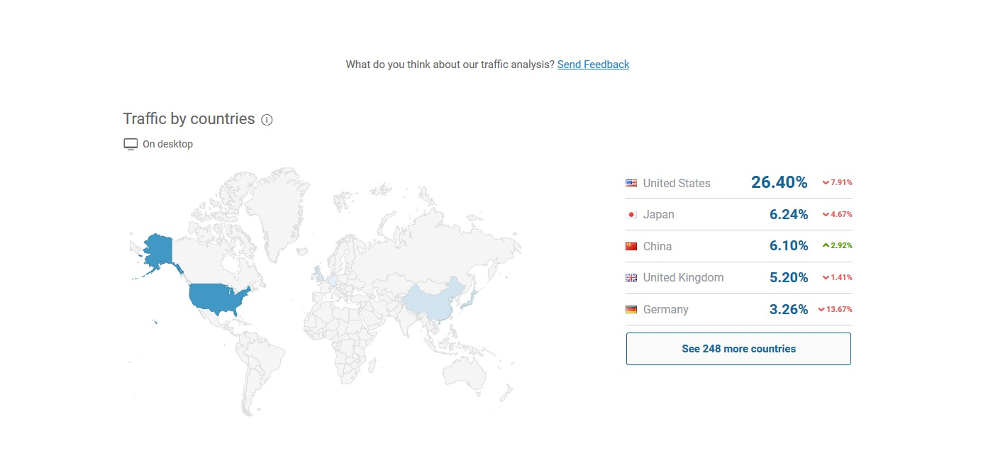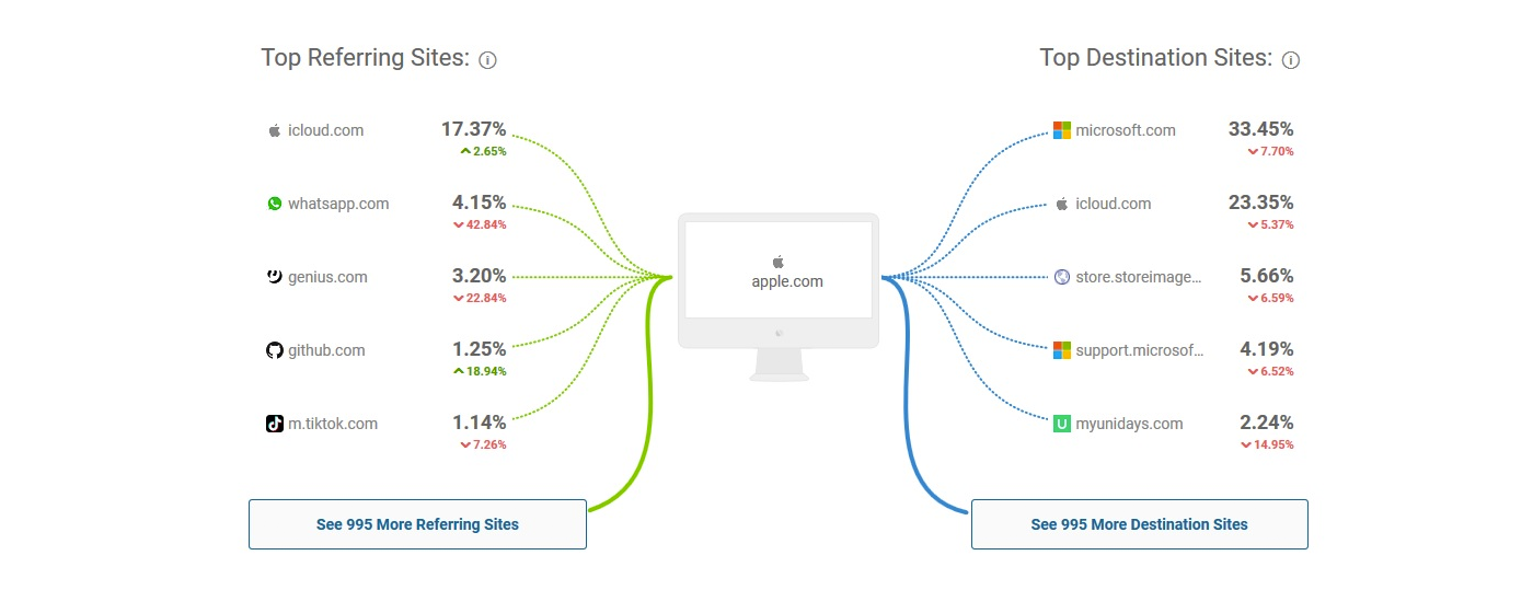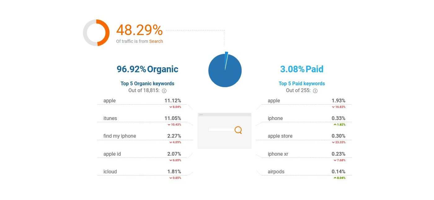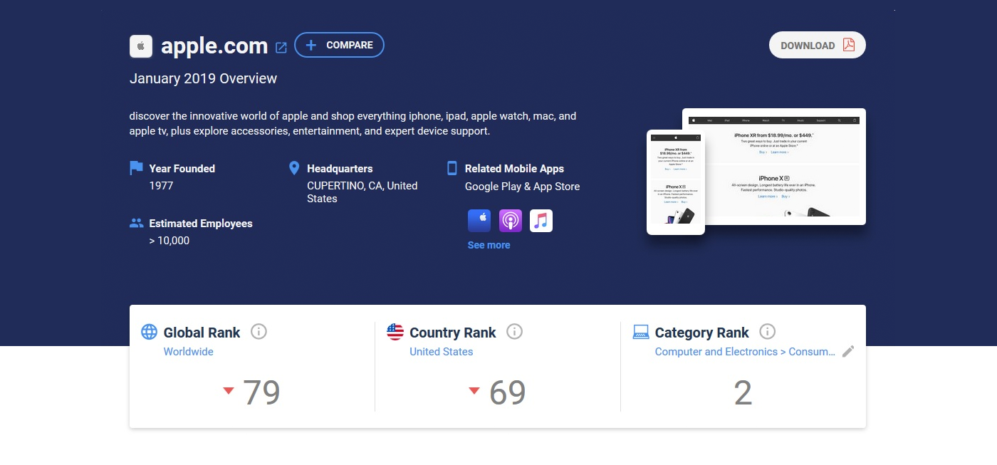 Сервис анализирует интернет-трафик – по регионам и нишам, определяет главных игроков в нишах. Данные выдает в виде диаграмм и графиков. В Similar Web можно оценивать сайты и мобильные приложения. Заходим на страницу сервиса, вводим сайт конкурента. Например, apple.com. Видим год основания компании, количество работников, адрес штаб-квартиры, мобильные приложения. Здесь же – рейтинг среди мировых сайтов, рейтинг по стране и по своей нише.