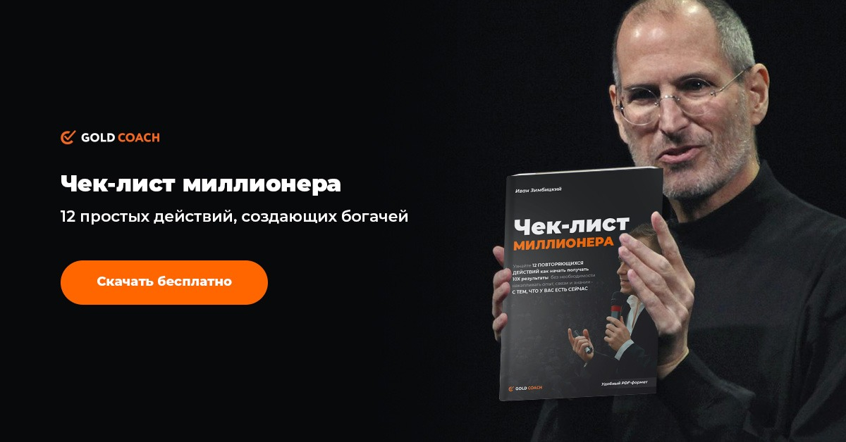 P. S. Как настроить мозг на богатство и обгонять конкурентов легко Иван Зимбицкий открывает в своем легендарном «Чек-листе миллионера». Успейте скачать, пока он в открытом доступе: Скачать «Чек-лист миллионера» сейчас