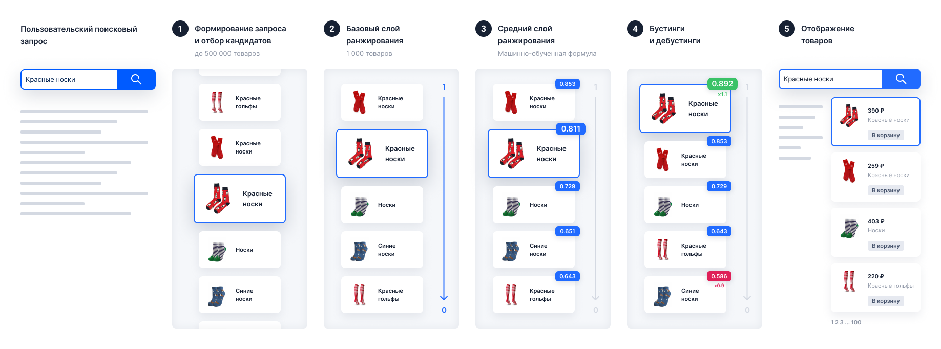 Для примера рассмотрим запрос «носки красные». Допустим, после прохождения трёх этапов поиска, включая машинно обученное ранжирование, товар с названием «носки красные» получает оценку 0,7.